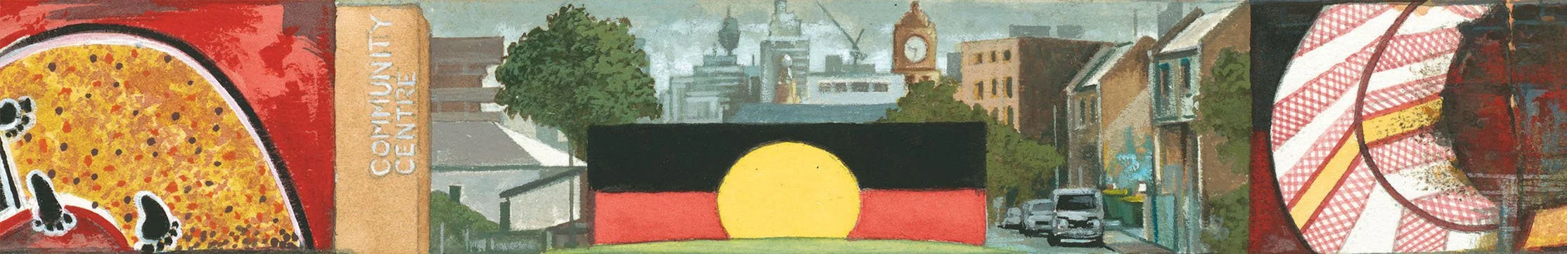 Over the years I have done a number of large paintings depicting the suburban and industrial areas of Australian cities including Sydney, Adelaide, Ballarat, Geelong and Broken Hill. I have also painted the NSW coastal area from Botany Bay to Broulee, and the ngurra of the Western Desert around the community of Papunya.